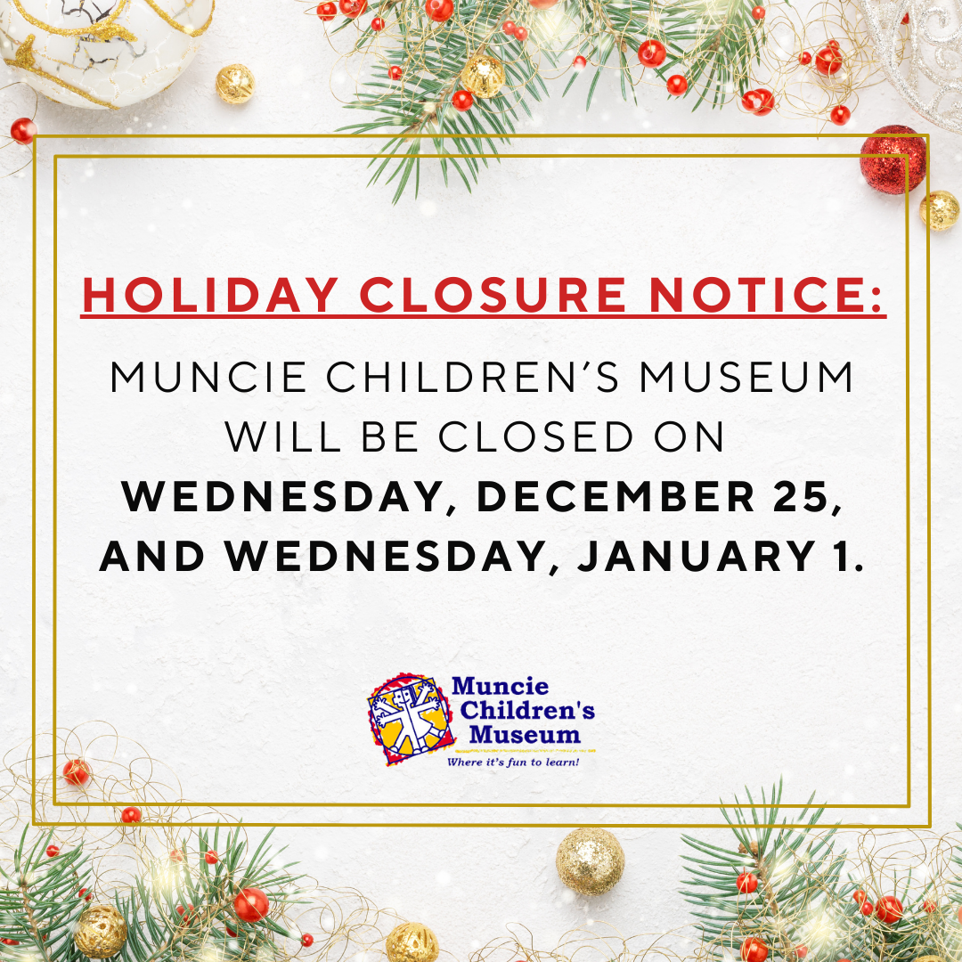 Muncie Children’s Museum will be closed on Christmas Day and New Year’s Day!