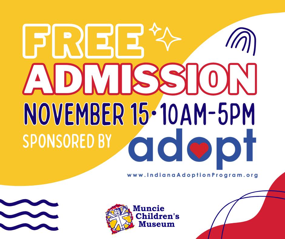 Join us at the Muncie Children’s Museum on Saturday, November 15th for a day full of fun and discovery! Thanks to our friends at the Indiana Adoption Program, admission to the Muncie Children’s Museum is free for all visitors from 10 am to 5 pm.