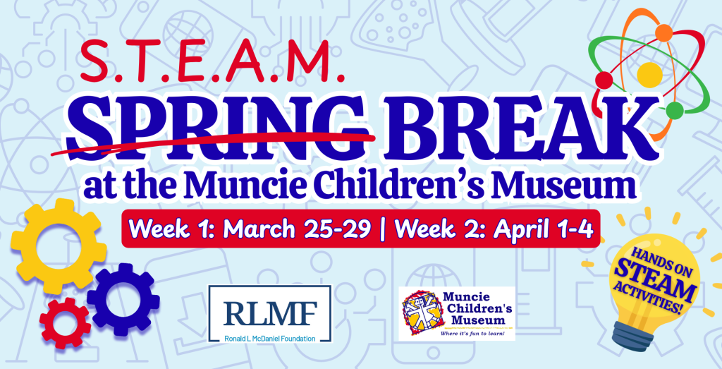 Spring Break is getting a STEAM-powered upgrade at the Muncie Children’s Museum! Join us for STEAM Break, where kids will explore Science, Technology, Engineering, Art, and Math through hands-on activities and playful learning.