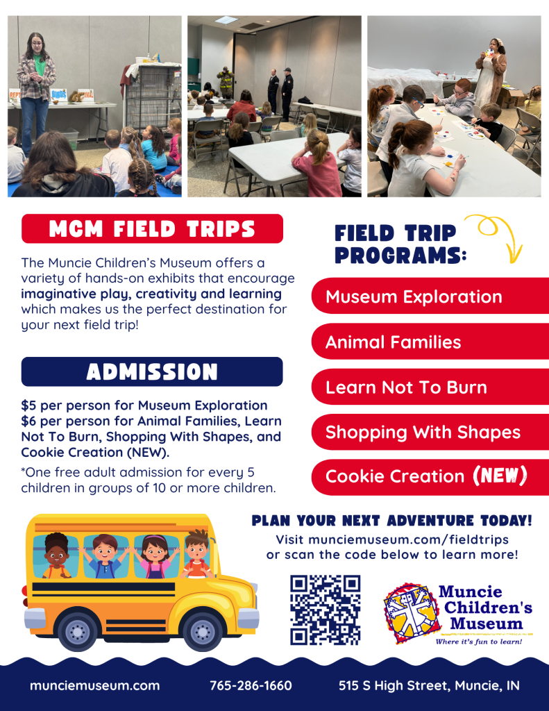 To register for a field trip, please call the museum at 765-286-1660 Wednesday – Friday, 10 a.m.-5 p.m., or fill out the Online Registration Form.