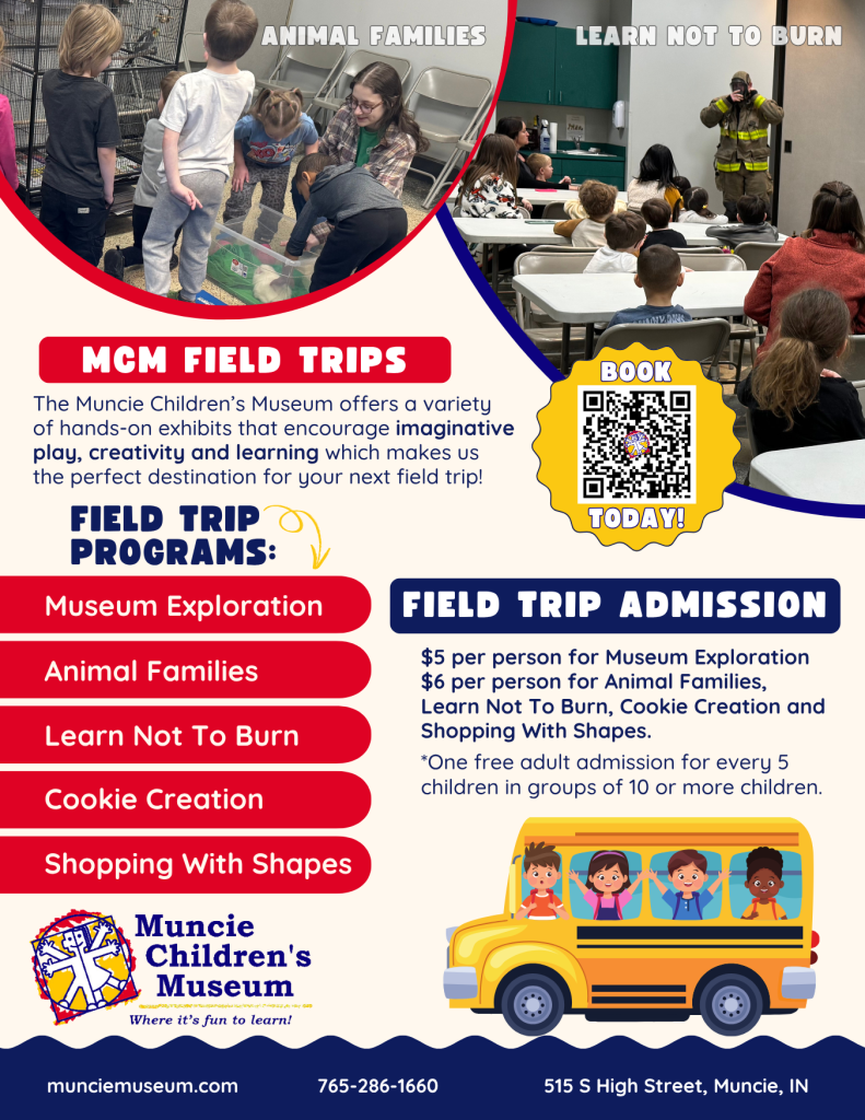The Muncie Children’s Museum is a place for hands-on learning. All group programs are allowed time for exploration, investigation, experimentation and fun in the museum. Programs are adapted according to the Indiana Academic Standards for Science and Literacy, which stresses across content areas and the big idea in grade-level curriculum.
