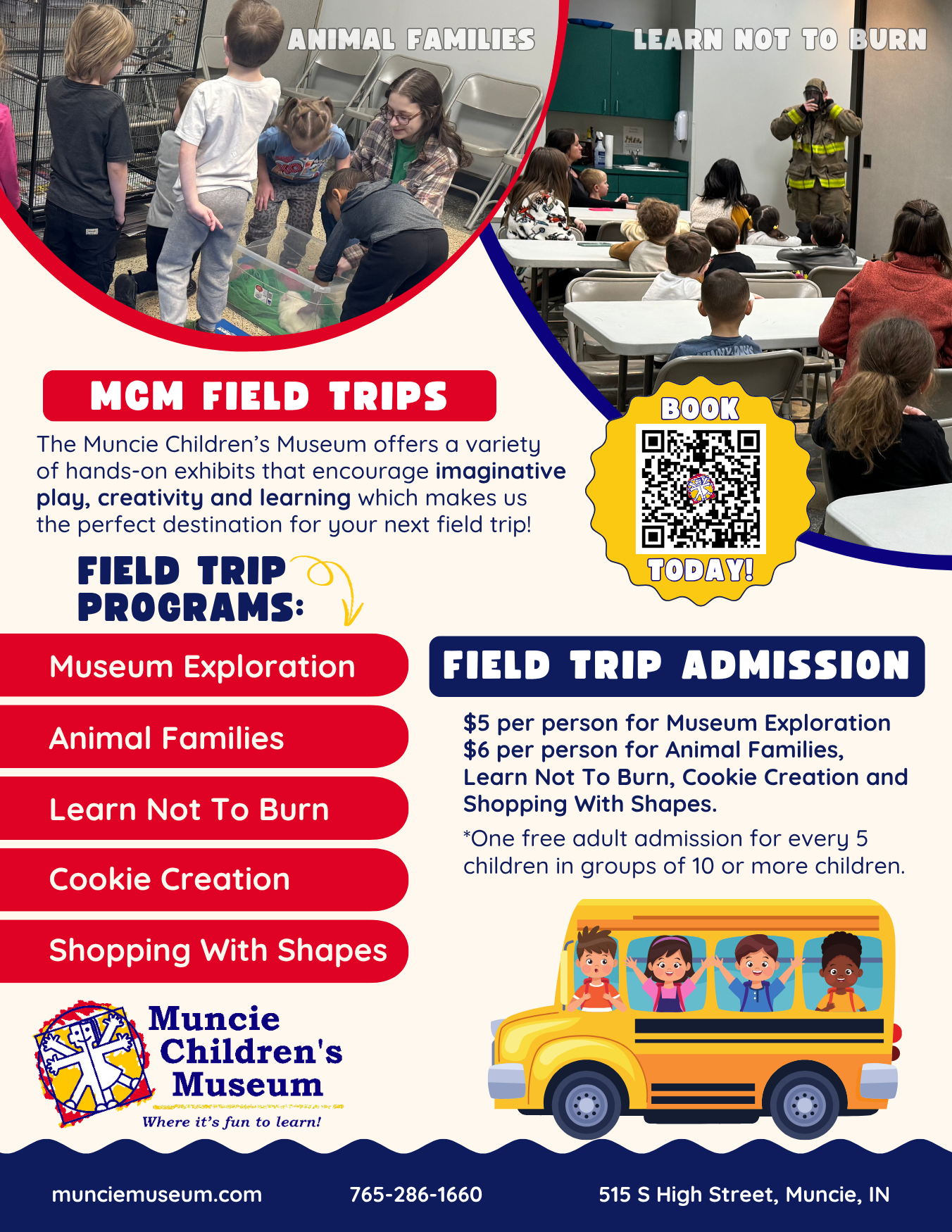 *Effective January 2025- field trip group rate is $5 per person for Museum Exploration and $6 per person for field trip programs: Animal Families, Learn Not To Burn or Shopping With Shapes.