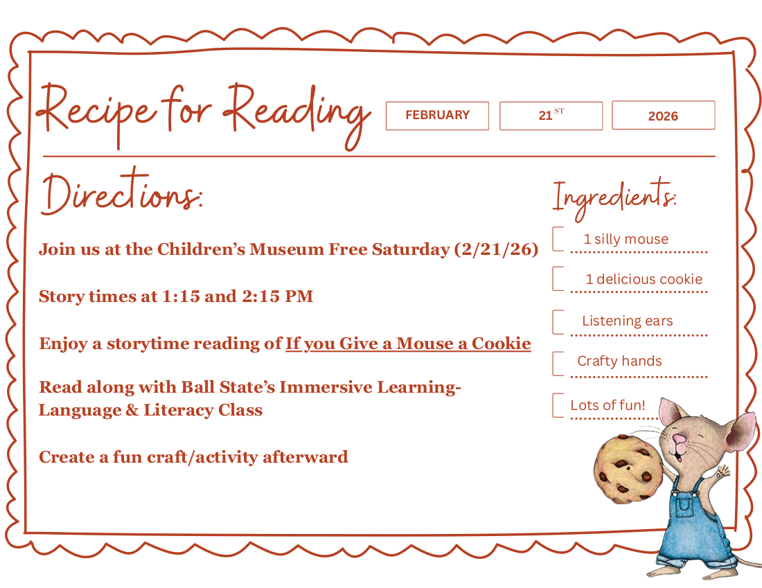 Enjoy special pop-up readings of If You Give a Mouse a Cookie and a fun activity presented by Ball State’s Immersive Learning – Language & Literacy students. These readings will be offered in conjunction with the Stuffie Clinic on Saturday, February 21st, at 1:15 pm and 2:15 pm, adding an extra dose of literacy fun to this fan-favorite event!