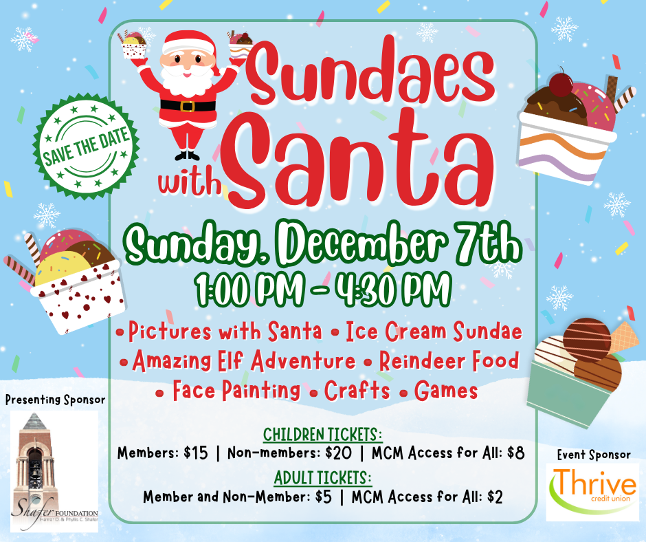 Join us on Sunday, December 7th, from 1:00–4:30 pm, for Sundaes with Santa, a sweet afternoon full of holiday fun for the whole family!